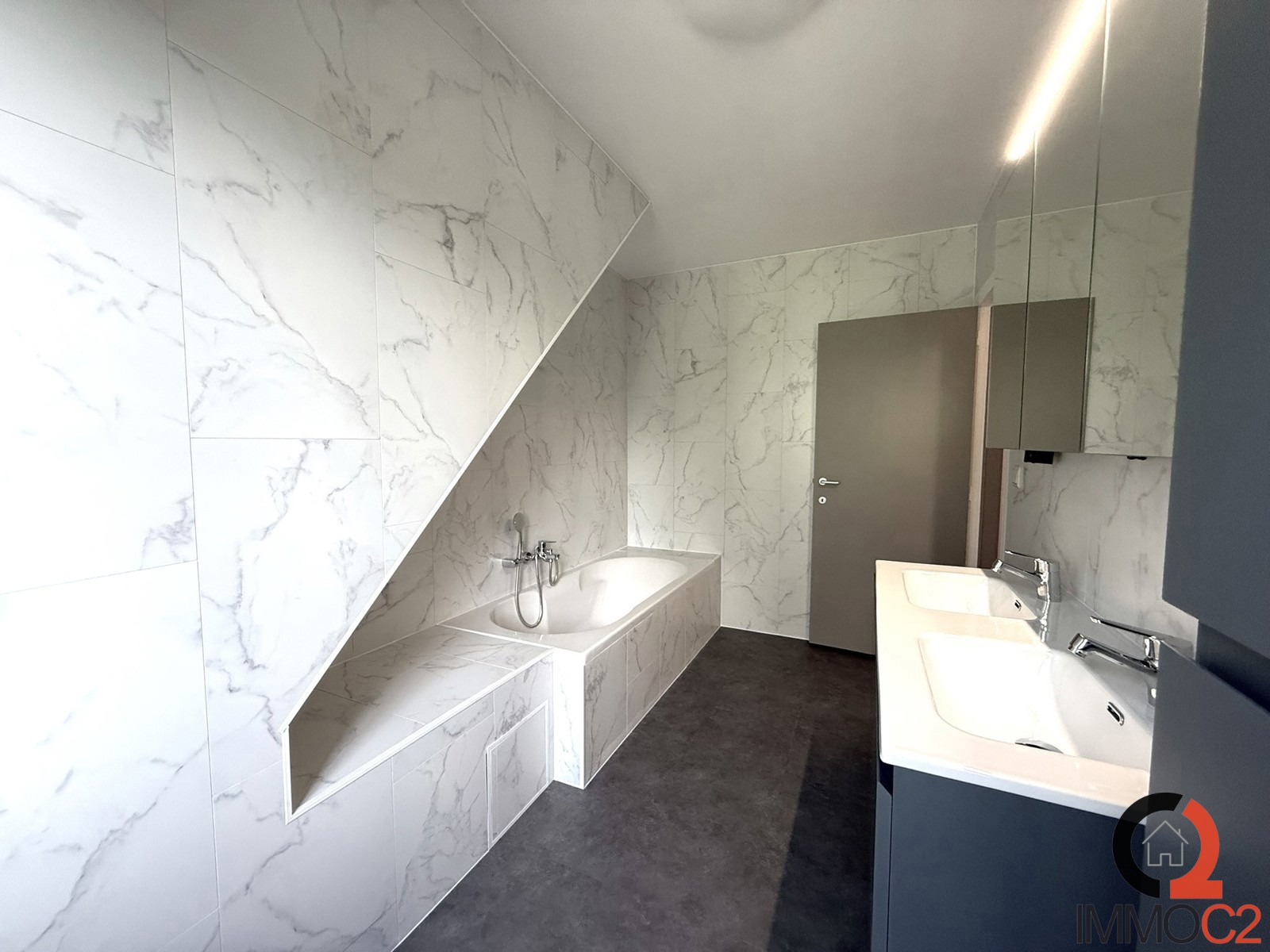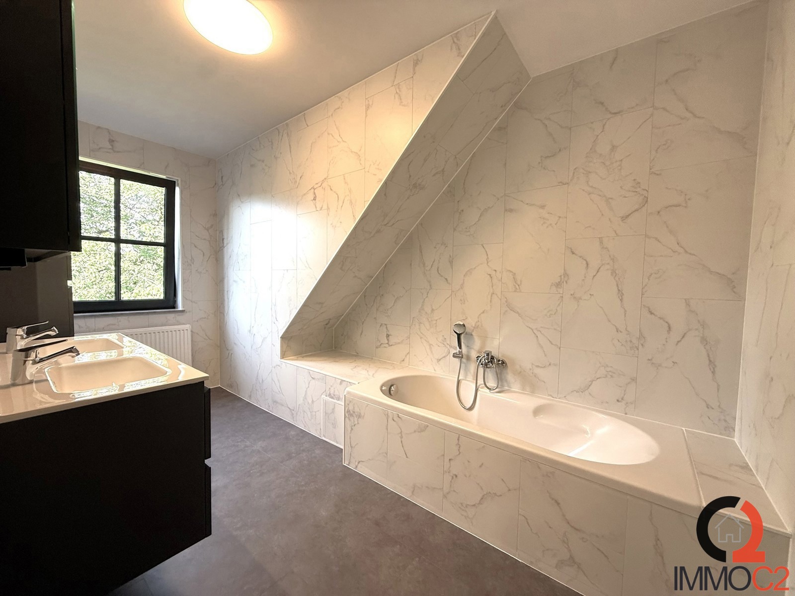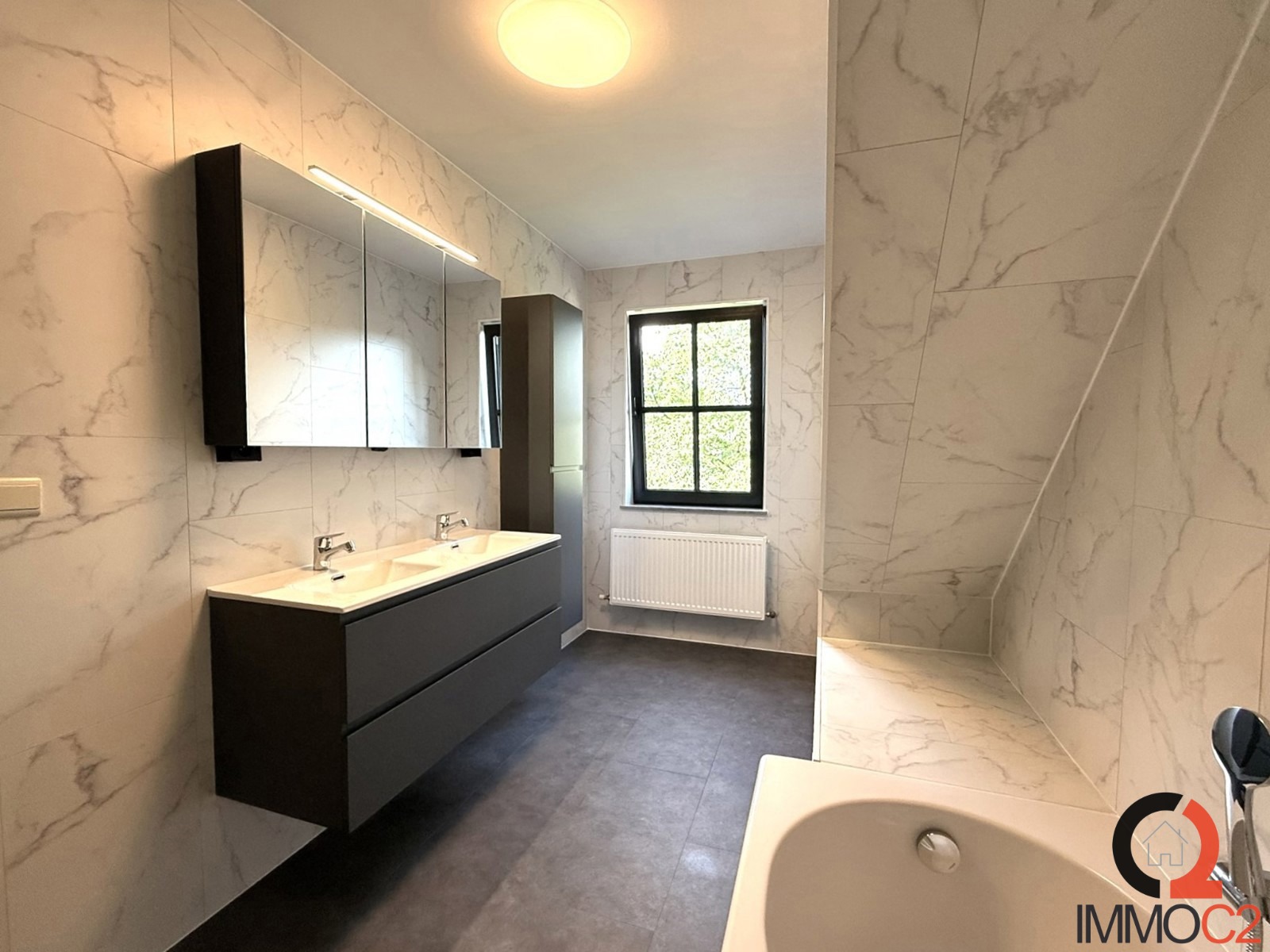 + Volledig vernieuwde badkamer met ligbad, nieuw badkamermeubel met dubbele lavabo en kolomkast