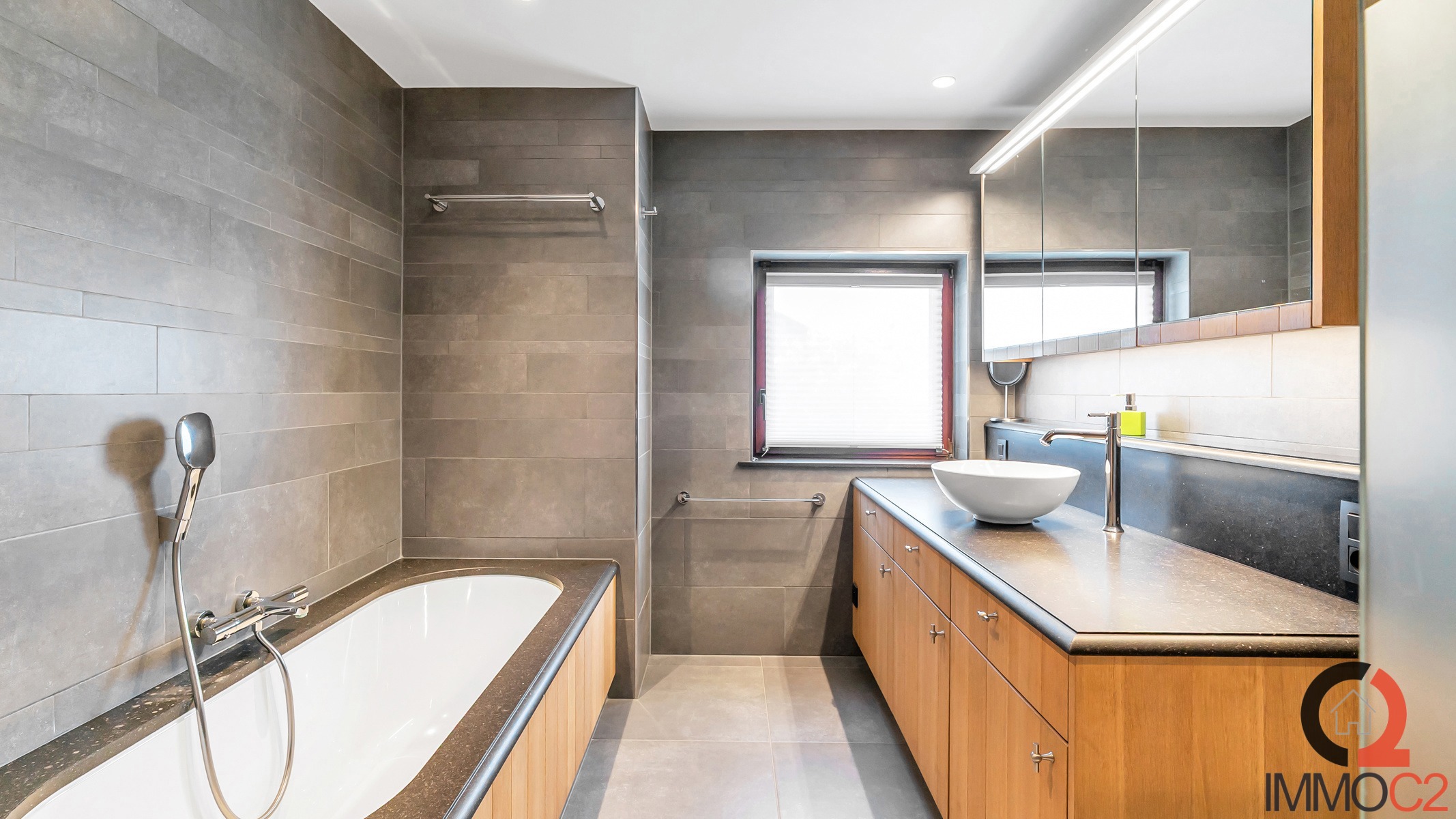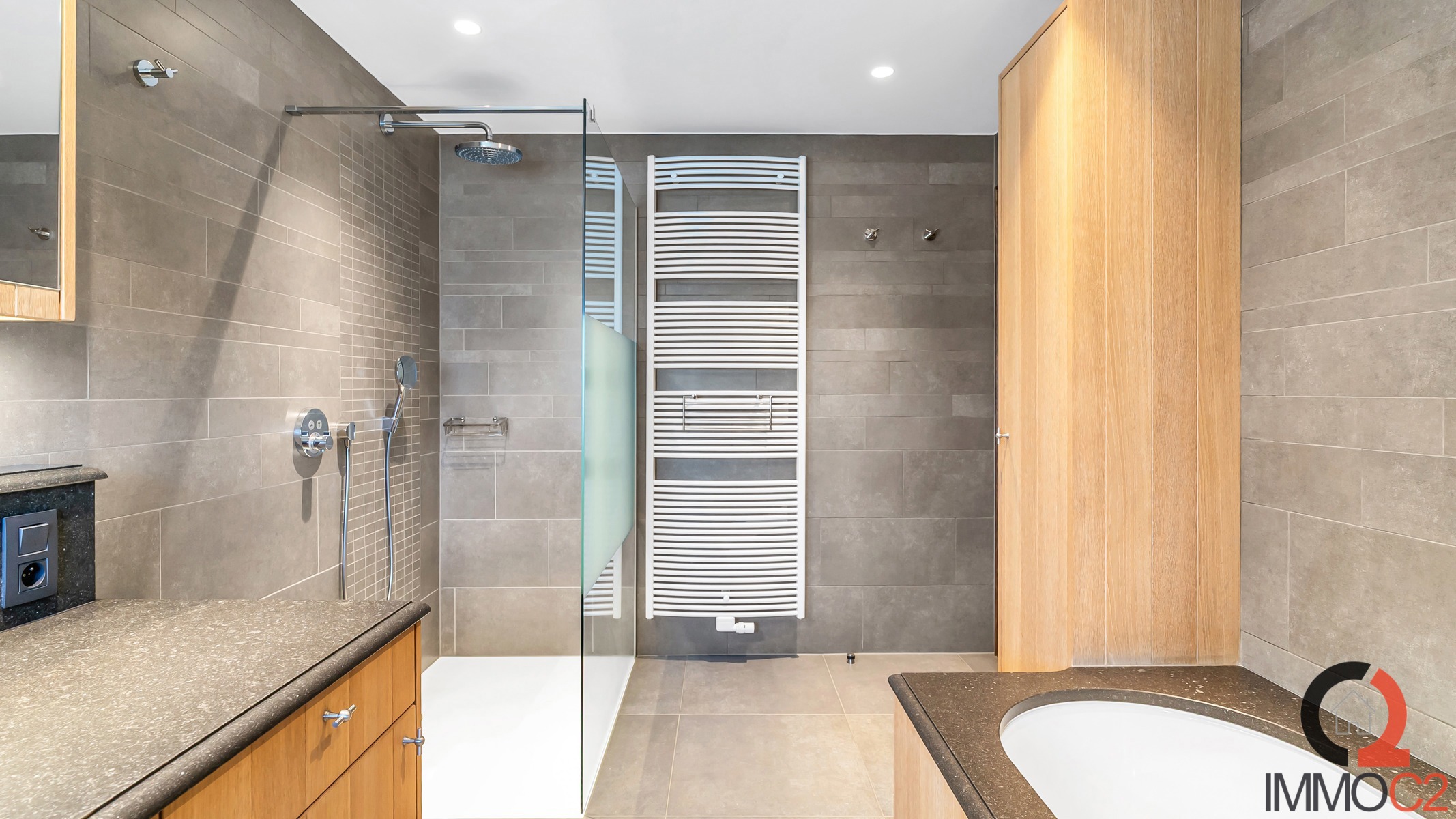 + Ingerichte badkamer met ligbad, inloopdouche, lavabomeubel en sierradiator