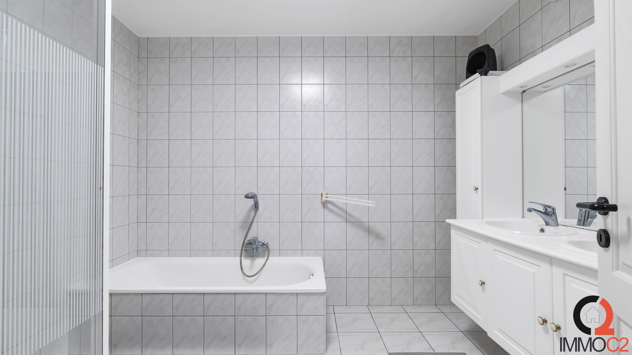 + Badkamer met dubbel lavabomeubel, ligbad en hoekdouche