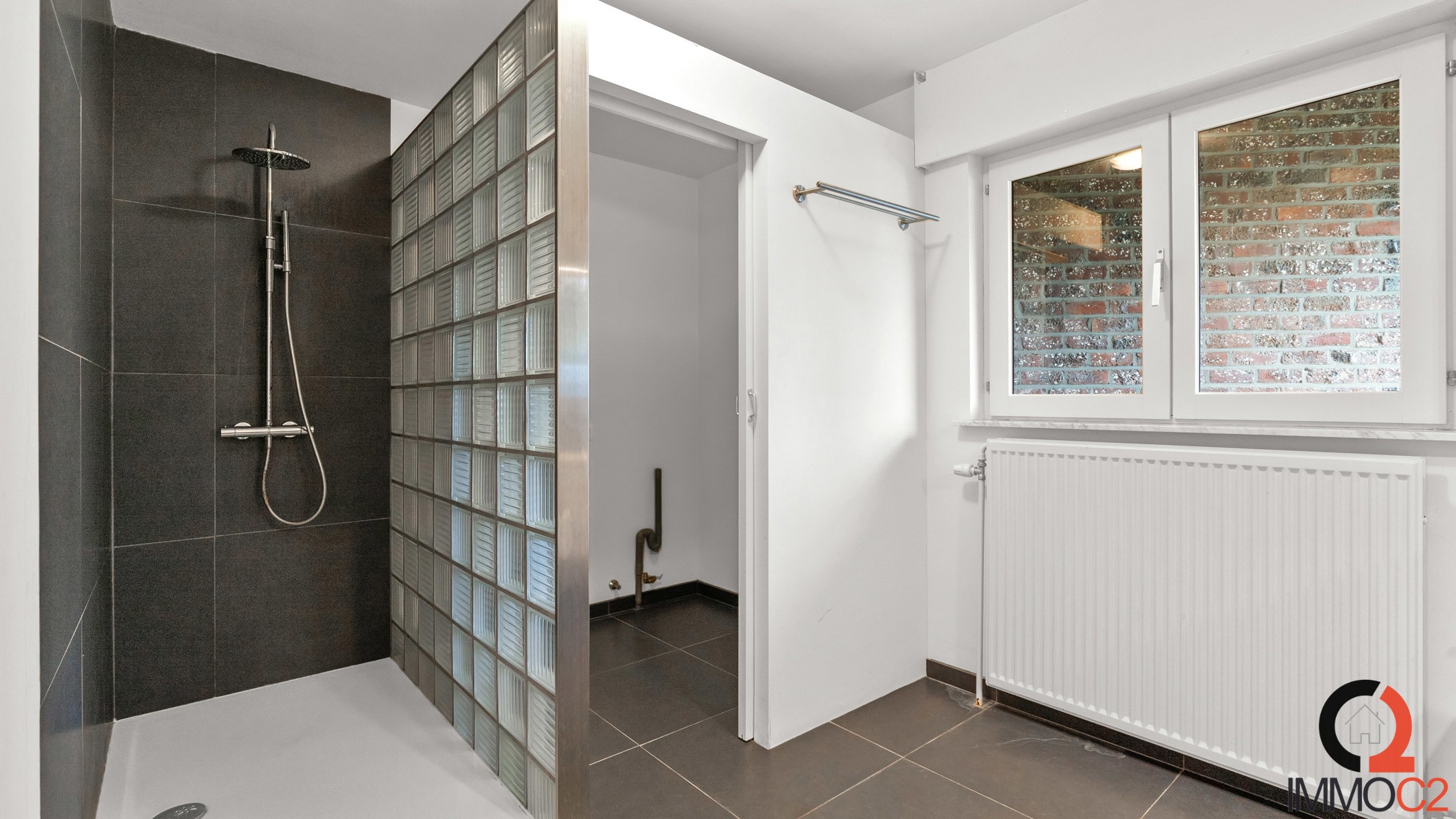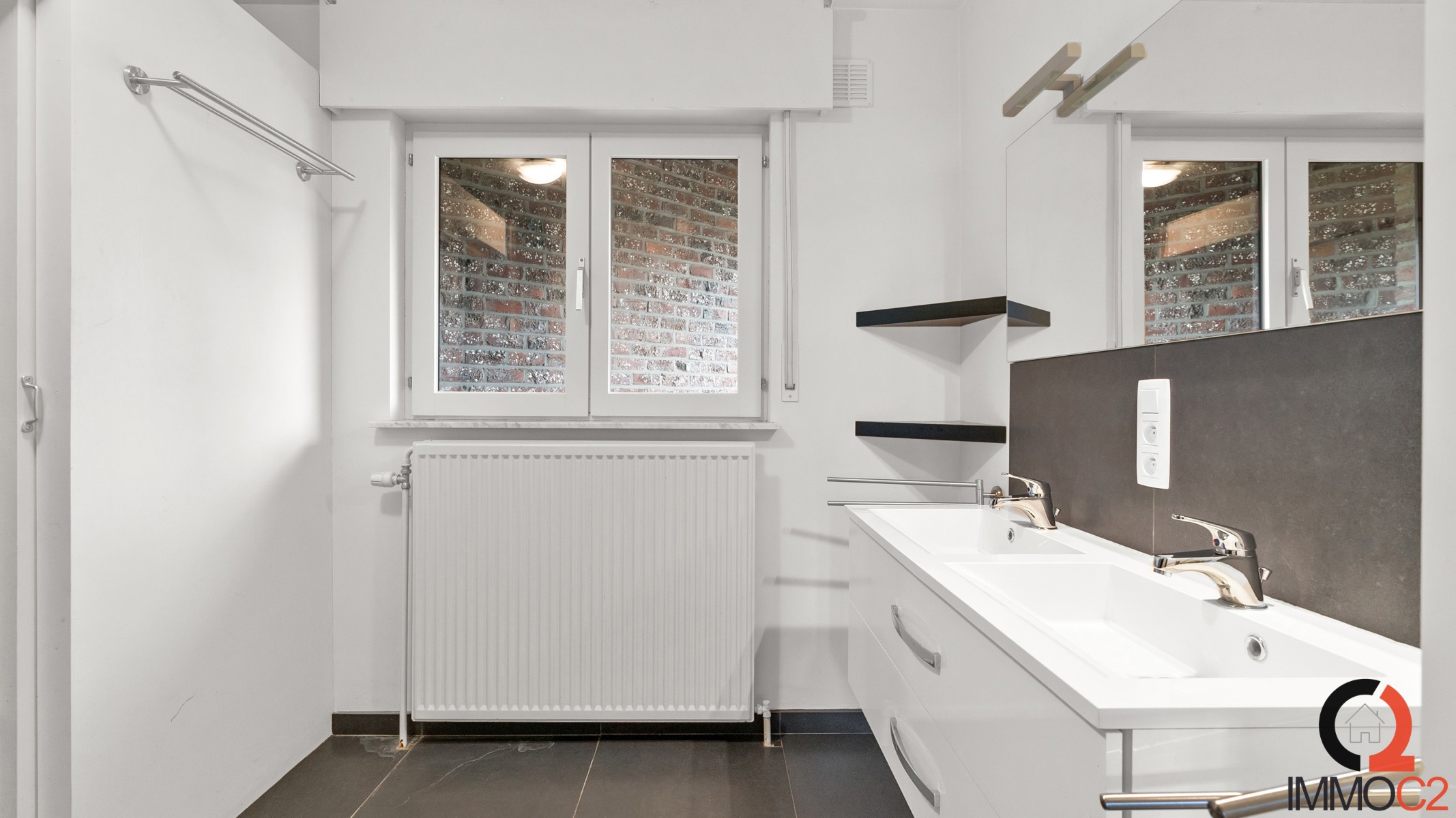 + Recent vernieuwde badkamer met inloopdouche en dubbel lavabomeubel, apart hoekje voorzien voor wasmachine en droogkast
