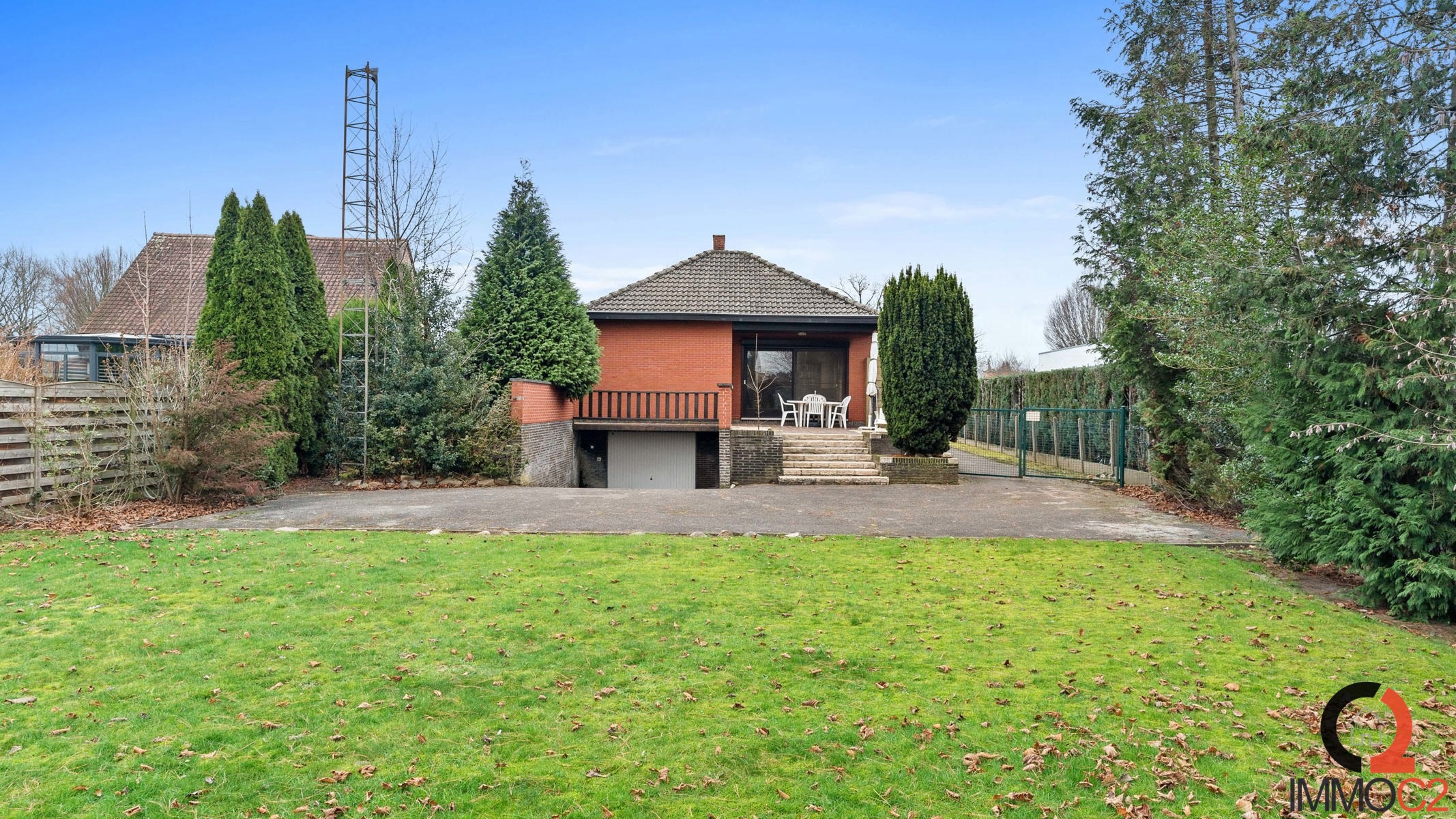 Achter de woning vinden we een verhoogd terras terug alsook de zuid-west georiënteerde tuin met inrit naar de ondergrondse garage.