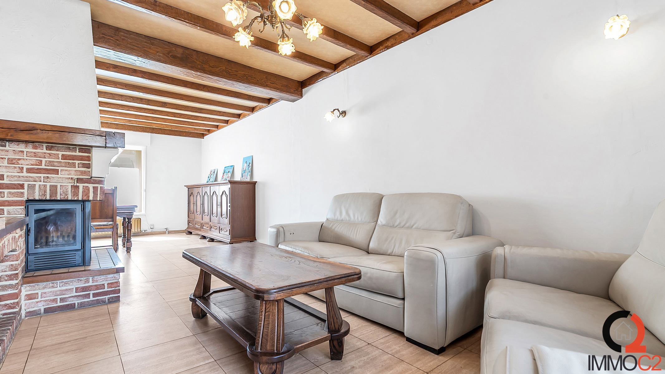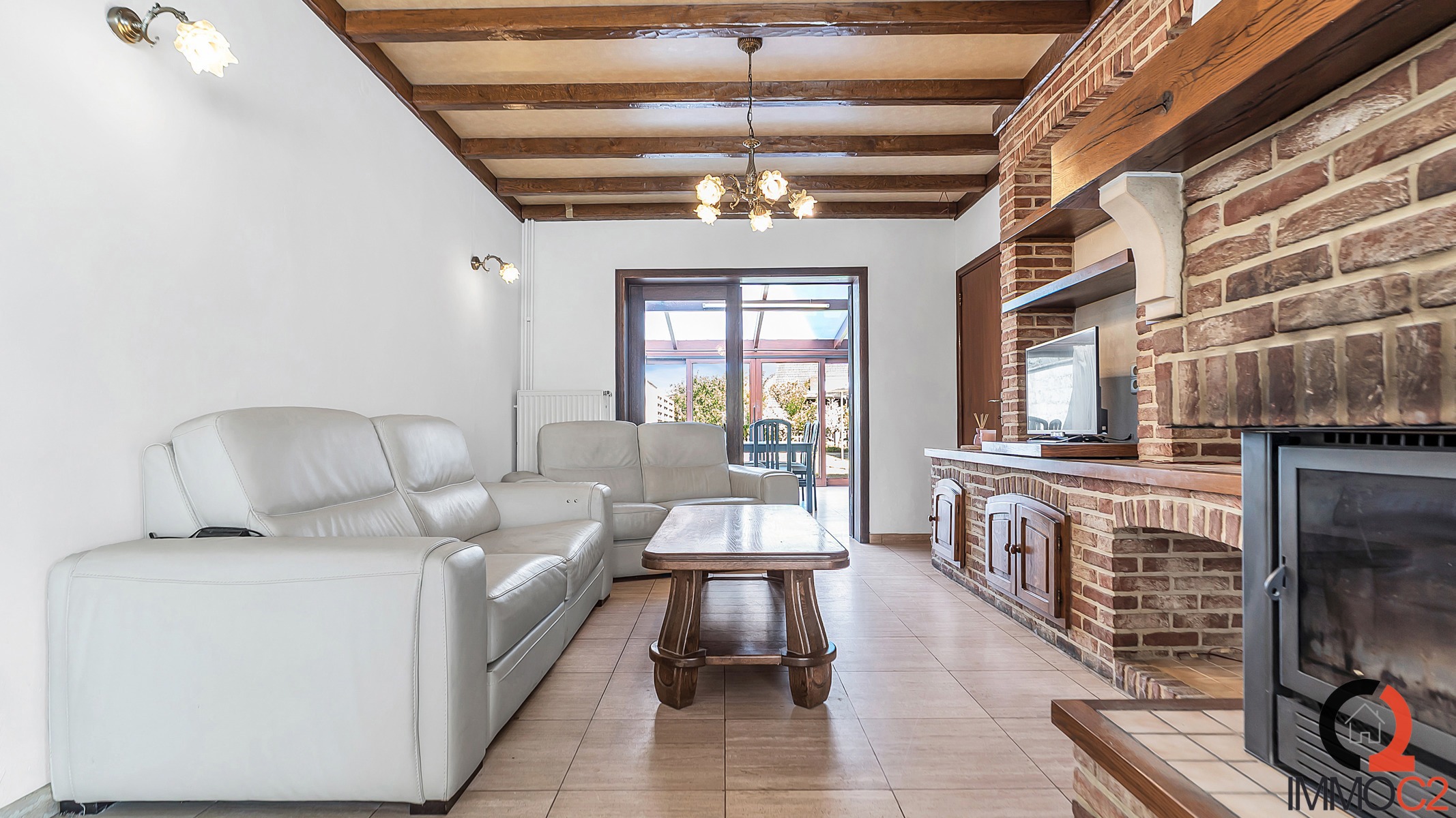 + Spatieuze L-vormige leefruimte met zithoek en eethoek, afgewerkt met natuurstenen vloer en gezellige inbouwcassette
