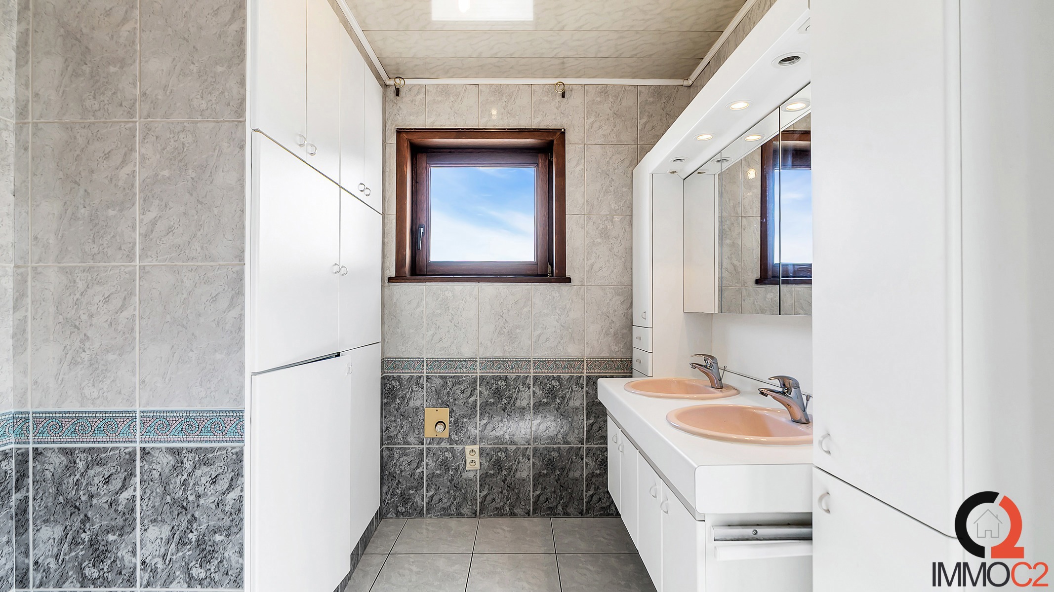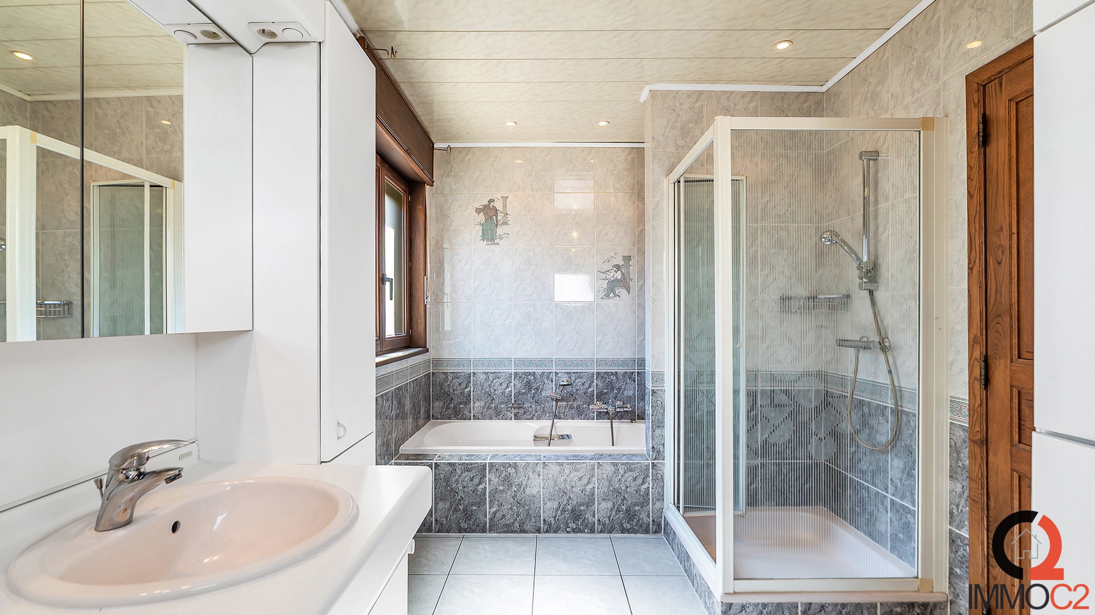 + Badkamer met ligbad, douche en dubbel lavabomeubel (aansluiting wasmachine en droogkast)